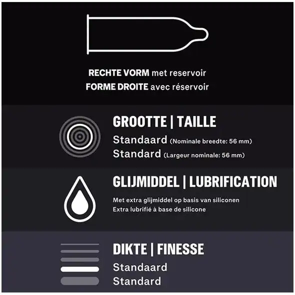 Ce prĂ©servatif contient un lubrifiant supplĂ©mentaire Ă base de silicone (dure 3 fois plus longtemps qu’un lubrifiant Ă base d’eau). Un lubrifiant supplĂ©mentaire assure un plaisir durable.