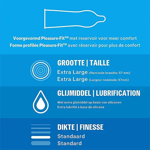 Cette longueur supplémentaire de 215 mm combinée à une largeur nominale de 56 mm offre un meilleur confort à ceux qui ont besoin d’un préservatif plus grand. Préservatif en caoutchouc naturel de grande taille, transparent, en forme, à extrémité de trayon, avec un lubrifiant non spermicide.