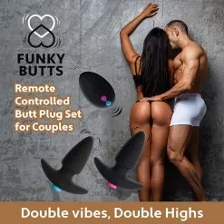 FunkyButts de Feelztoys est un ensemble de 2 plugs vibrants avec télécommande pour les couples qui peuvent être portés par les deux partenaires en même temps pendant les rapports sexuels. La télécommande peut être utilisée pour les deux plugs, qui peuvent être actionnés individuellement.