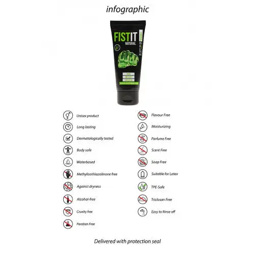 Fist It Lubrifiant Natural Ă base d’eau composĂ© d’ingrĂ©dients naturels. Ce lubrifiant vĂ©gĂ©talien est exempt de parfums synthĂ©tiques, de colorants et de conservateurs. L’emballage est en plastique recyclĂ©.