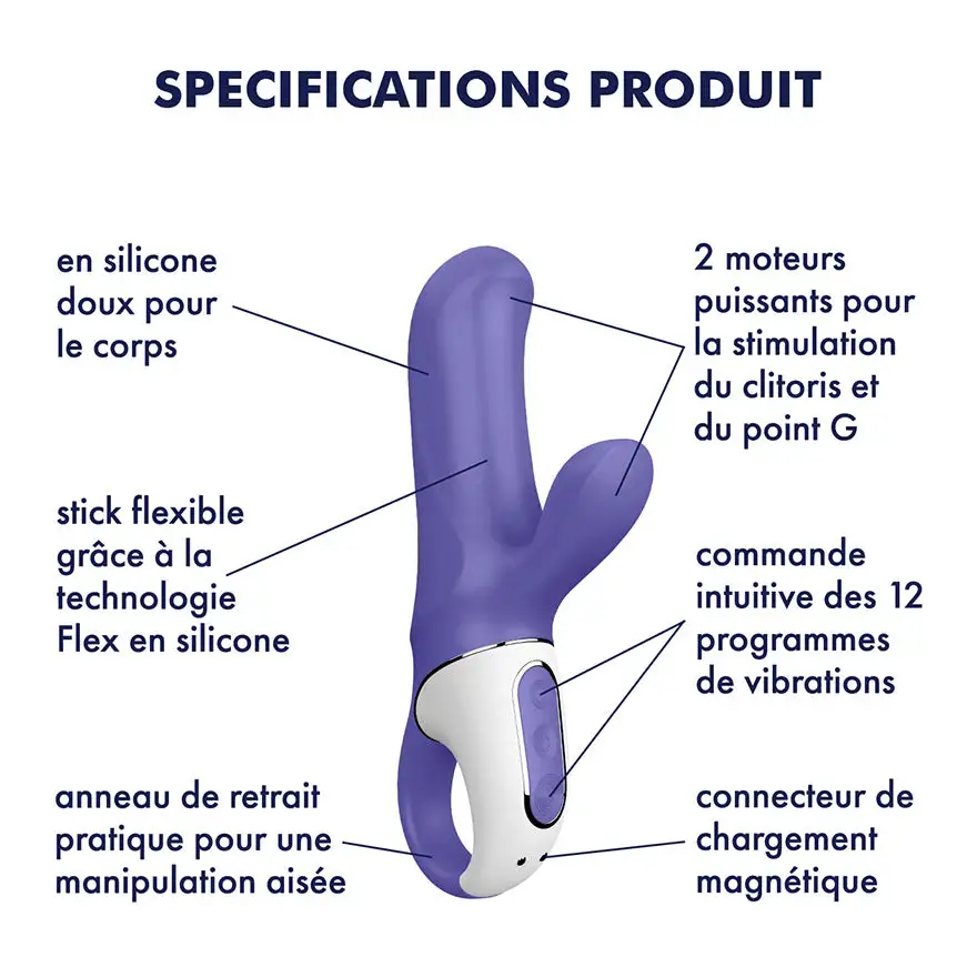 Grâce à sa fabrication étanche (IPX7), le Magic Bunny t’accompagnera volontiers dans les endroits humides, que ce soit sous la douche, dans la baignoire ou dans ta piscine privée. Lorsqu’il s’essouffle, ses batteries intégrées peuvent être rechargées grâce au câble de chargement USB inclus. Le silicone hygiénique peut être facilement nettoyé avec quelques sprays de Toy Cleaner, comme le Disinfectant Spray Satisfyer. Pour une expérience en douceur, nous recommandons l’utilisation d’un lubrifiant à base d’eau.