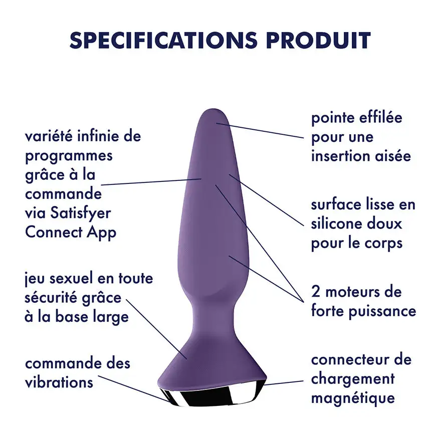 Les vibrations profondes du Satisfyer Plug-ilicious 1 Plug Anal Vibrant sont générées par deux moteurs et peuvent être commandées intuitivement par une App. De plus, le Plug-ilicious 1 séduit par sa surface en silicone souple, sa forme conique et sa base large sécurisante.