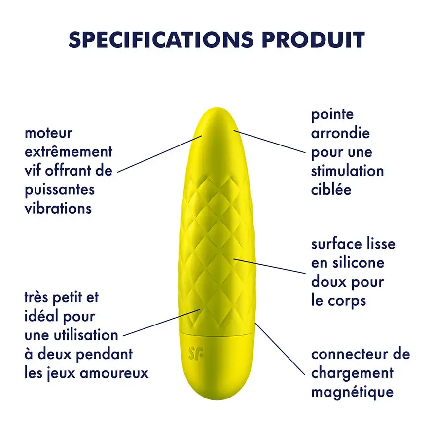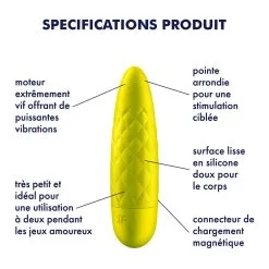 Le Satisfyer Ultra Bullet 5 Mini Vibromasseur Jaune sait comment vous chouchouter intensément avec des vibrations profondes. Grâce à son design matelassé et à sa forme volumineuse, ce mini vibromasseur tient bien en main et vous permet de profiter de plaisirs variés.