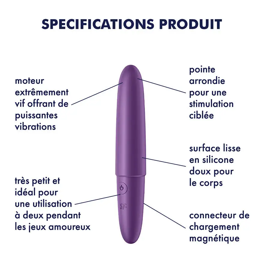 Si vous aimez la simplicité, le Satisfyer Ultra Bullet 6 Mini Vibromasseur est exactement le mini vibromasseur qu’il vous faut : son design fonctionnel et son fonctionnement simple vous garantissent un plaisir rapide et efficace.