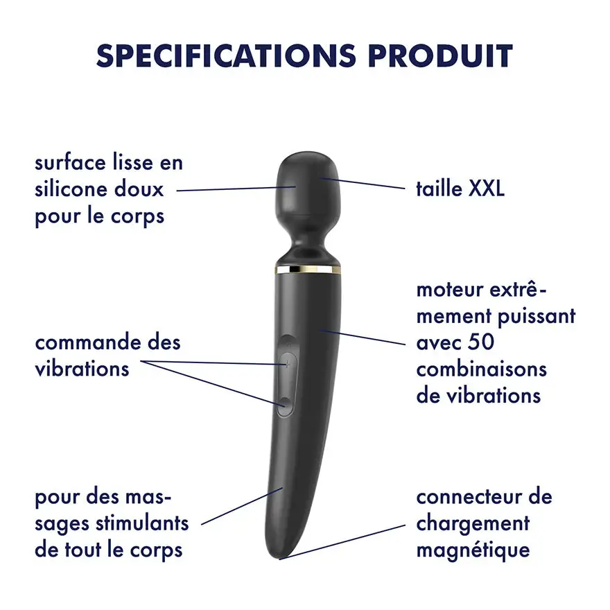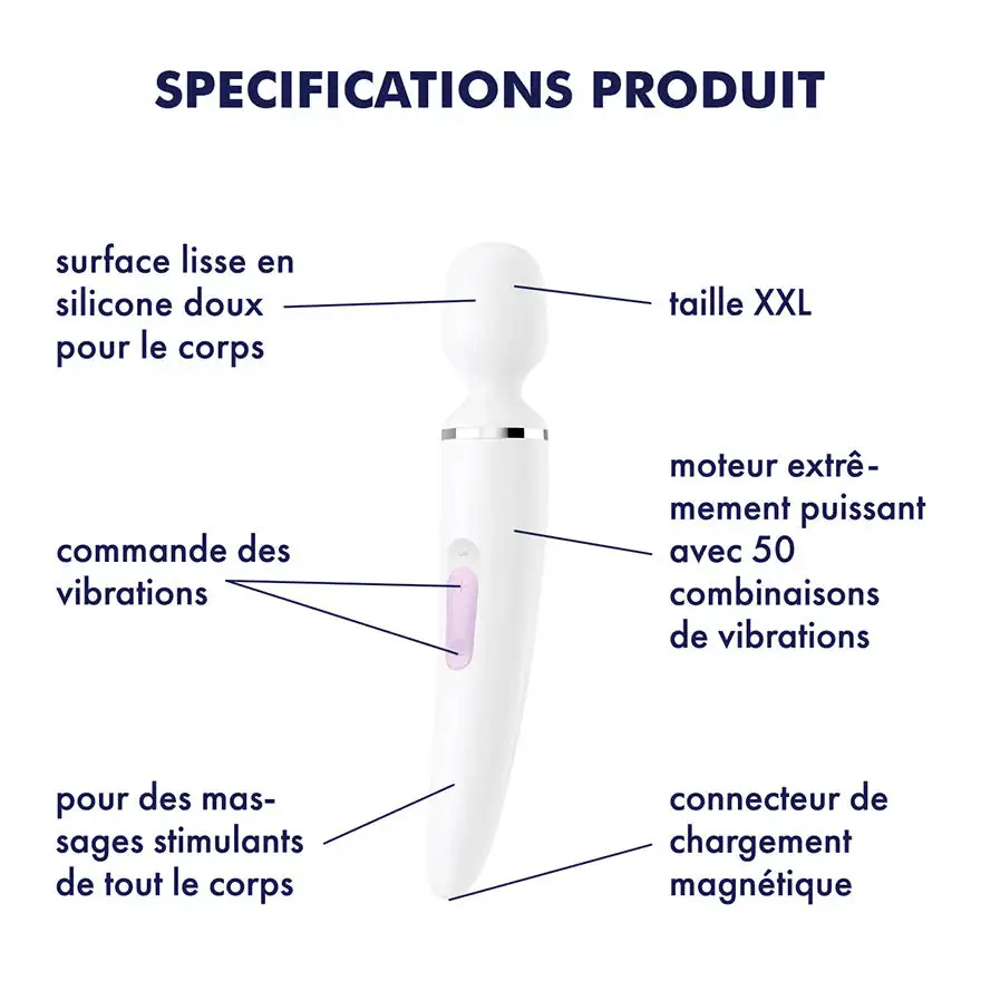 Le Satisfyer Wand-er Woman Magic Vibro Masseur convient aux massages thérapeutiques sur tout le corps et, grâce à sa forme profilée et sa taille impressionnante, il vous émoustillera, vous ou votre partenaire, en stimulant vos parties les plus intimes.