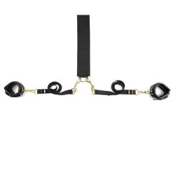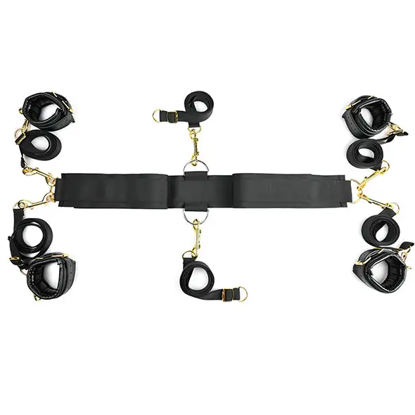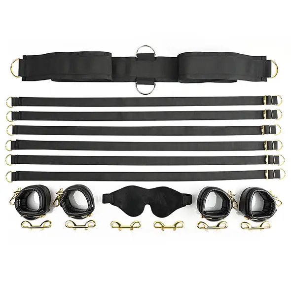 Une sangle de connexion d’ancrage en nylon solide se glisse sous votre matelas pour fixer six sangles de retenue rĂ©glables. Quatre sangles se terminent par des poignets et des chevilles en similicuir de haute qualitĂ© avec du matĂ©riel dorĂ©, tandis que deux sont conçues avec des boucles qui promettent un effet de levier de toutes sortes. Placez les sangles autour de votre matelas comme vous l’aimez, attachez votre amoureux fermement et glissez le bandeau en velours doux sur ses yeux pour une session pleine de surprises.