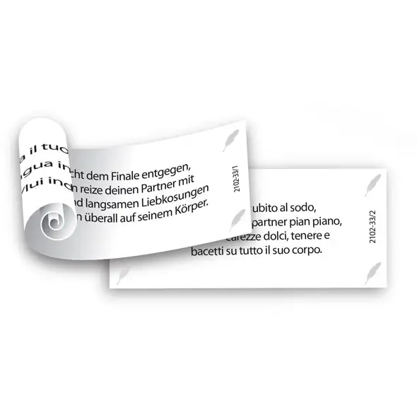 La recherche montre que les chances de satisfaction sexuelle sont considérablement augmentées par de nombreux préliminaires. Non seulement le plaisir est beaucoup plus grand, mais le sexe ultérieur devient également plus intime et intense. préliminaires. Les devoirs sur papier blanc sont pour lui, ceux sur papier rose pour elle.