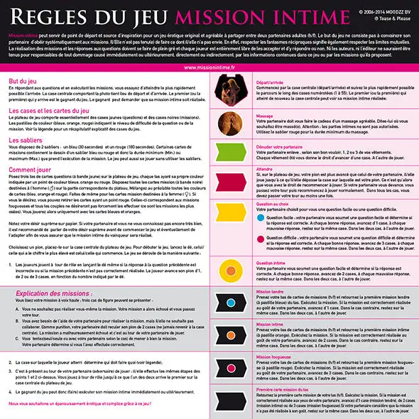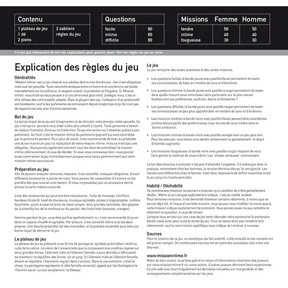 De façon ludique, les barrières sont brisĂ©es et vous vous rapprochez. Le jeu est dĂ©sarmant, excitant, direct et audacieux, parfois hilarant mais jamais sans respect. Rien n’est obligatoire dans ce jeu et tout peut ĂŞtre fait selon vos prĂ©fĂ©rences. Avant de commencer Ă jouer, chaque joueur exprime son dĂ©sir ultime. Cela peut ĂŞtre un souhait Ă©rotique longtemps chĂ©ri ou juste un bon petit dĂ©jeuner au lit. Le gagnant voit son dĂ©sir ultime exaucĂ© et le partenaire est autorisĂ© Ă rĂ©aliser ce souhait. Donc, en fait, ce jeu n’a pas de perdants.